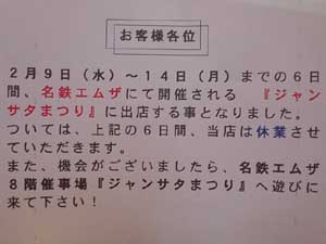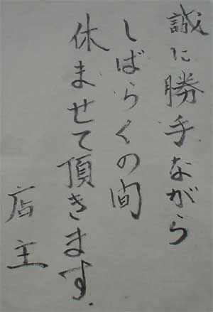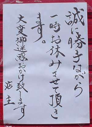 政心 店舗入り口の張り紙によると、修行のため長期休業とのことです。(2004年12月11日)