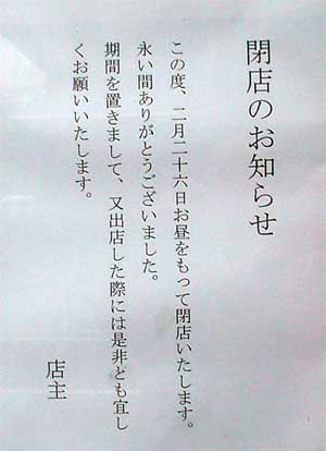 2005年1月11日を最後の営業日として閉店しました。富山で再出発するとの事です。(2005年1月11日)