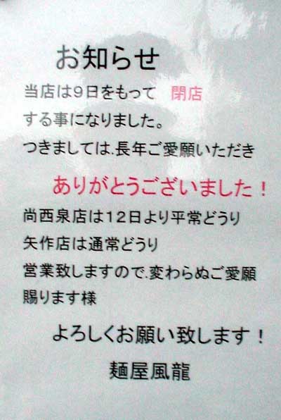 片町の尾道ラーメン跡の上海麺房は約3週間前から営業していないようです(2004年11月1日)。