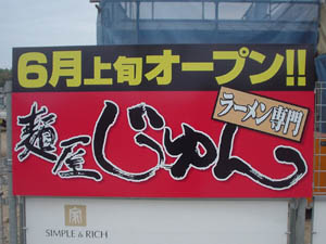 「ラーメン専門 麺屋じゅん」が6月上旬にオープンするとのことです。