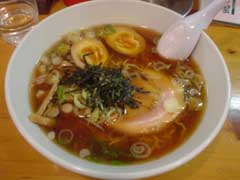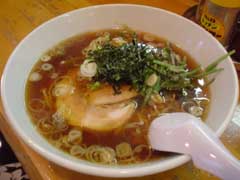どうぞと出されたラーメン。やや濁った褐色のスープに大きなロールチャーシューが一枚、メンマとねぎ、そして海苔がかかり、