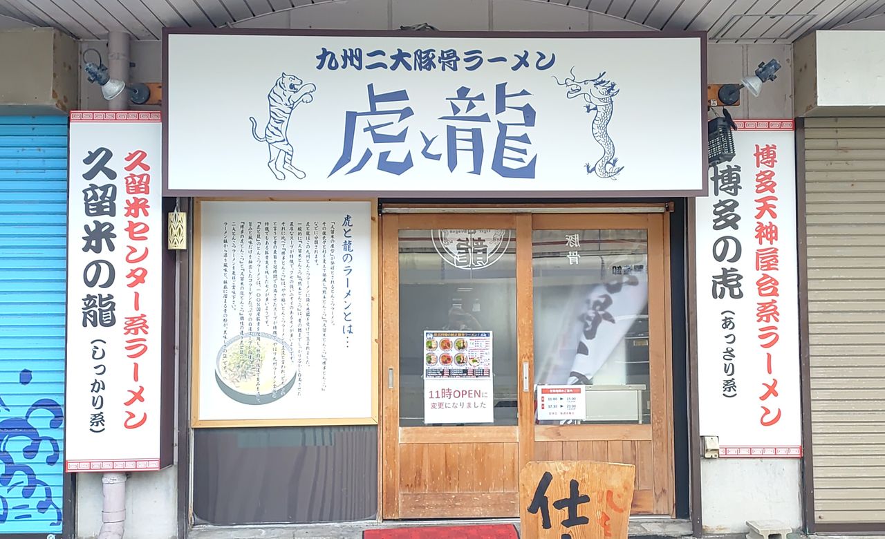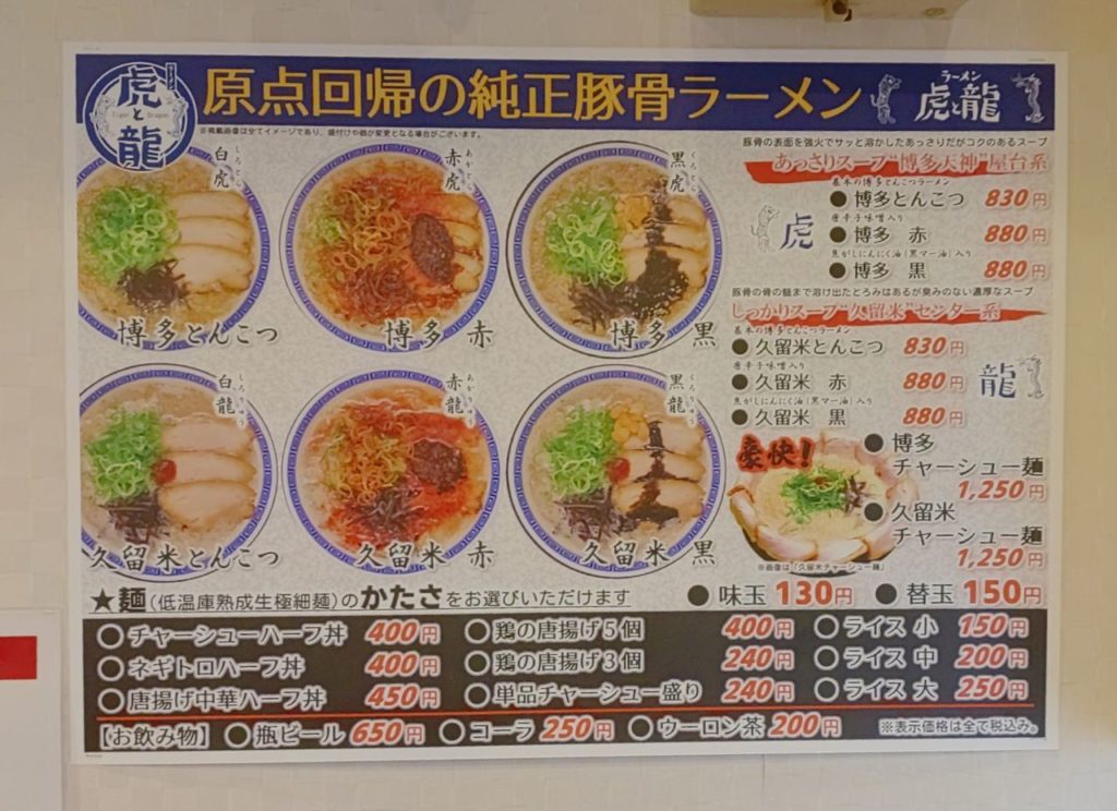店舗前からみて左に久留米の虎、右に博多の虎とあるので、久留米系と思って入店し券売機前のメニューを見ると、左上は博多系なんですね。