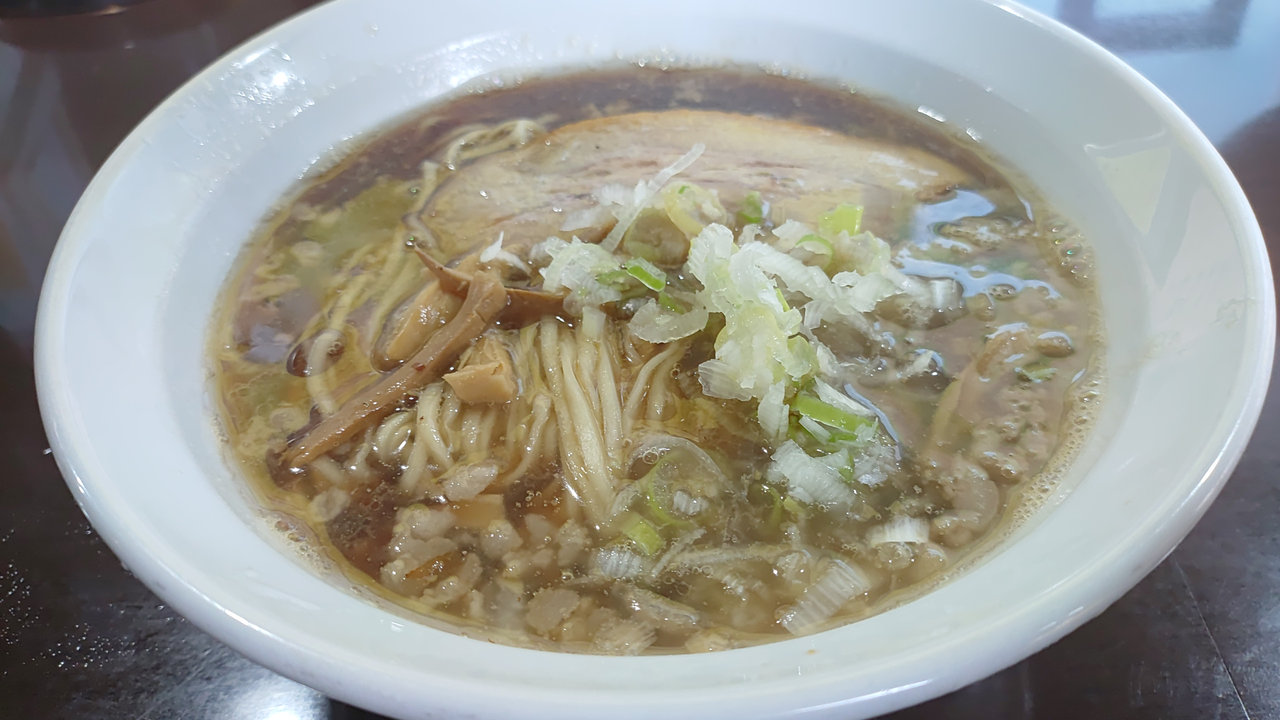 着丼したラーメンは、澄み切った黄金色の醤油スープに、尾道系の特徴である背脂のミンチが浮かぶ美しいビジュアル。