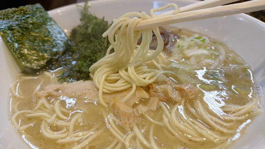 細麺の硬めで頼んだ麺が、ちょっと濃い目の豚骨スープに良くマッチし、満たされたお昼でした。