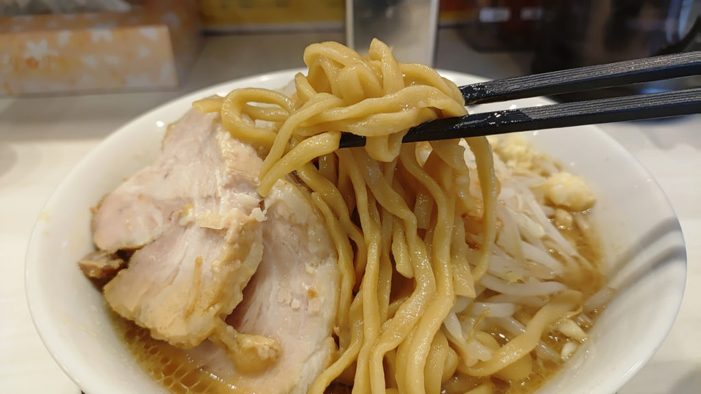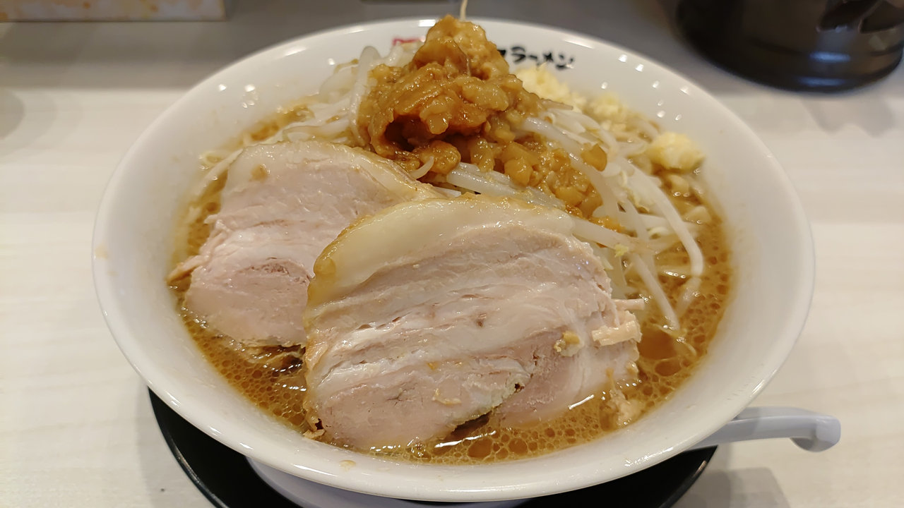 二郎系の店では着丼までにある程度の時間を要するのが常ですが、驚いたのはその提供スピードです。予想よりも早く目の前に現れた丼には、もやしの山に背脂が降りかかり、追加したチャーシューが鎮座する、食欲をそそる光景が広がっていました。ニンニクは「少なめ」で頼んだものの、実際にはなかなかの量が盛られており、このあたりにはサービス精神の良さが伺えますが、都合を考えると・・・別皿で頼むと良いのかな。